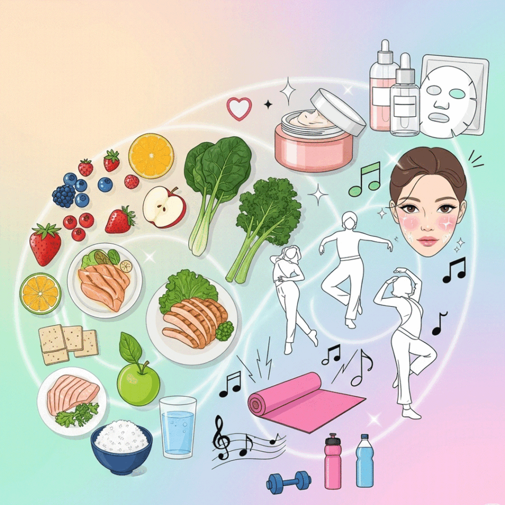 Most K-pop idols follow a detailed skincare routine that may include up to ten steps: oil cleanser, foam cleanser, exfoliation, toner, essence, serum, sheet mask, eye cream, moisturizer, and sunscreen. This multi-layered process focuses on maintaining hydration, reducing inflammation, and promoting a natural glow.