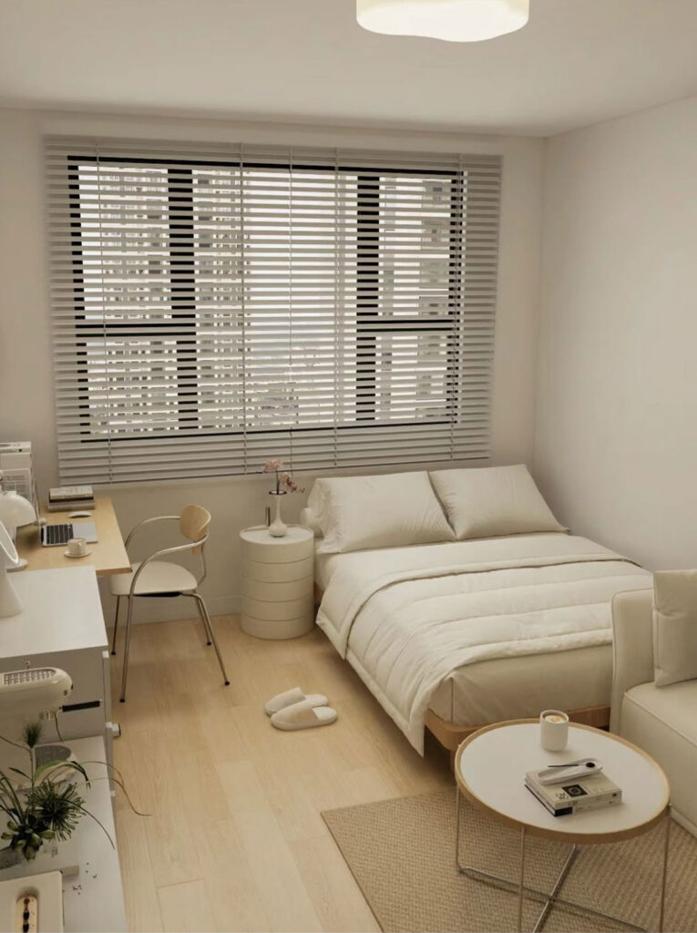 The principle of minimalism is “less is more.” Avoid placing too many items or unnecessary decorations. Focus only on the essentials—bed, desk, wardrobe, and a few supporting accents.